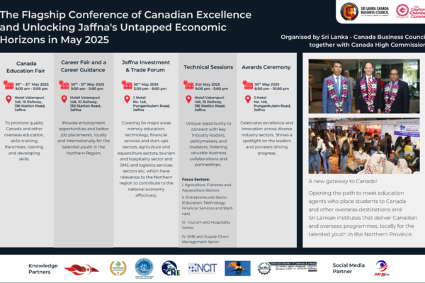 The Sri Lanka Canada Business Council Established on August 14, 1991, operates under the Ceylon Chamber of Commerce. With over 140 member companies, it aims to enhance investment, bilateral trade, and joint ventures. The council also facilitates trade and investment information exchange with Canadian institutions and represents business interests between Sri Lanka and Canada.
