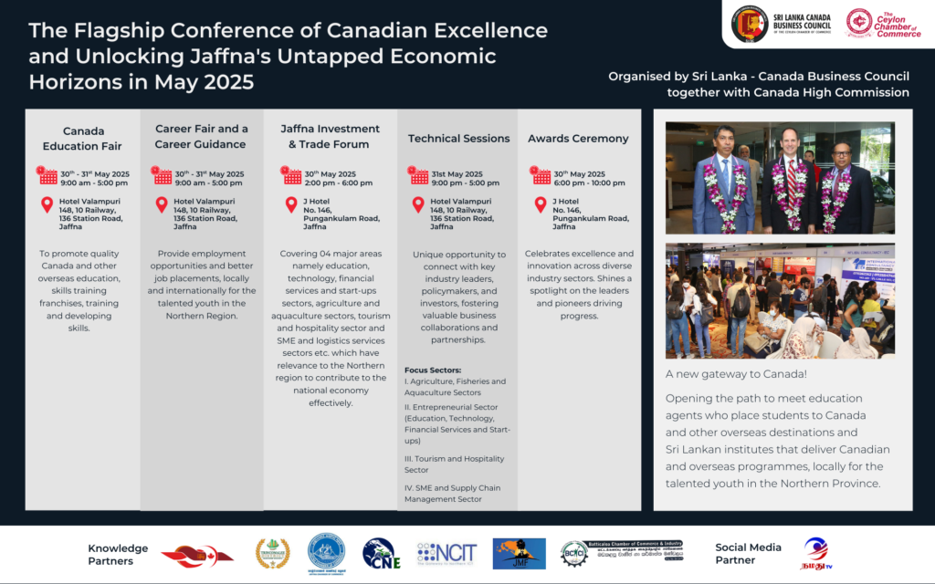 The “Canada Educational Fair and Jaffna Investment & Trade Forum” organized by the Sri Lanka – Canada Business Council (SLCBC) of the Ceylon Chamber of Commerce together with the Canada High Commission in Colombo, in collaboration with the Canada Sri Lanka Business Convention.